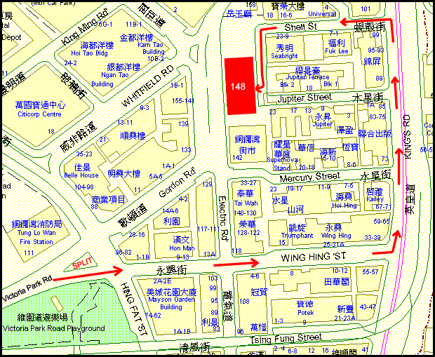 148 Electric Road, North Point, Hong Kong MTR Directions: We are located between the Tin Hau Station and Fortress Hill Station. Choose either station to exit depending on which direction you are coming from. If you are exiting via the Fortress Hill Station then choose the "A" exit and walk westbound on Oil Street until you hit Electric Road then make a left. If you are exiting via the Tin Hau Station then choose the "A2" exit and walk northbound on Electric Road. Taxi Directions: If you cannot speak Cantonese, you might want to print out the Chinese address below to show to the driver in case he cannot speak English. (Translates to: 148 Electric Road, North Point, Hong Kong) Parking Lot Directions: You can park your car in the parking lot directly inside the building via the rear entrance. You need to be going northbound on King's Road to make a left into Shell Street which leads to the parking lot. The street sign for Shell Street is constructed on the wrong side of the street and can easily be missed while driving. There is a building on the corner of Shell Street that says Sing Pao Building. You can use that as an indicator as to when to make the turn. Please refer to the map below and note the red arrows. If you are coming in from the Central direction and intend to park the car in the parking lot then please pay attention to the two-way split shown near the lower left of the map above. There is a large street sign near this location that reads Electric Road (left side) and Causeway Road (right side). You need to take the right side of the split (not Electric Road) and continue straight until you hit King's Road as indicated by the red arrows above. Information on how to get back on King's Road (southbound) after leaving the parking lot